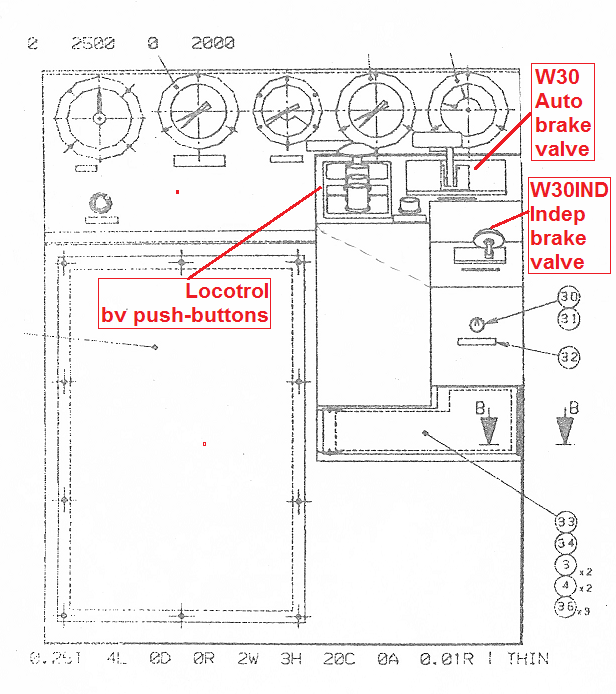 Dash 8 rebuild. Builder’s drawing – 6. Engineer’s side elevation section showing air brake valve detail (W30 equipment) and instrument detail. View looks from forward edge of engineer’s seat towards the brake valve cluster and forward instrument panel.