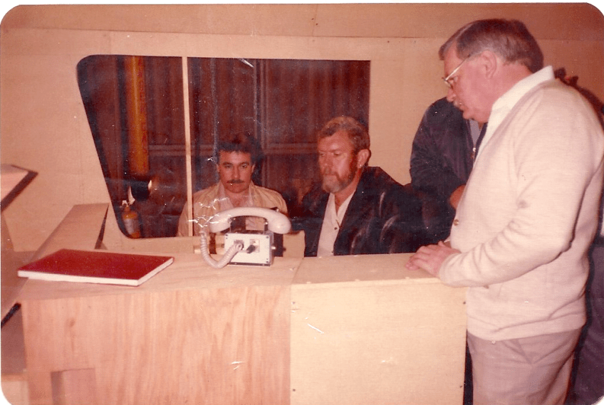 CabDesign7 4 Published May 2, 2017 at 1037 × 696 in CabDesign7 4 MNM cab committee members, Allan Zanders and the author (outside) examine the Alco-Dash 7 rebuild cab mock-up at the Goninan factory. MNM Railroad Operations Superintendent, Des Ablett is standing.