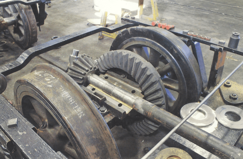 An unusual feature is that the longitudinal shafts are on a different plane to the axles and the main drive shaft (see exterior view of locomotive). The longitudinal shafts pass above the centre-line of the axles and below the centre-line of the main drive shaft.