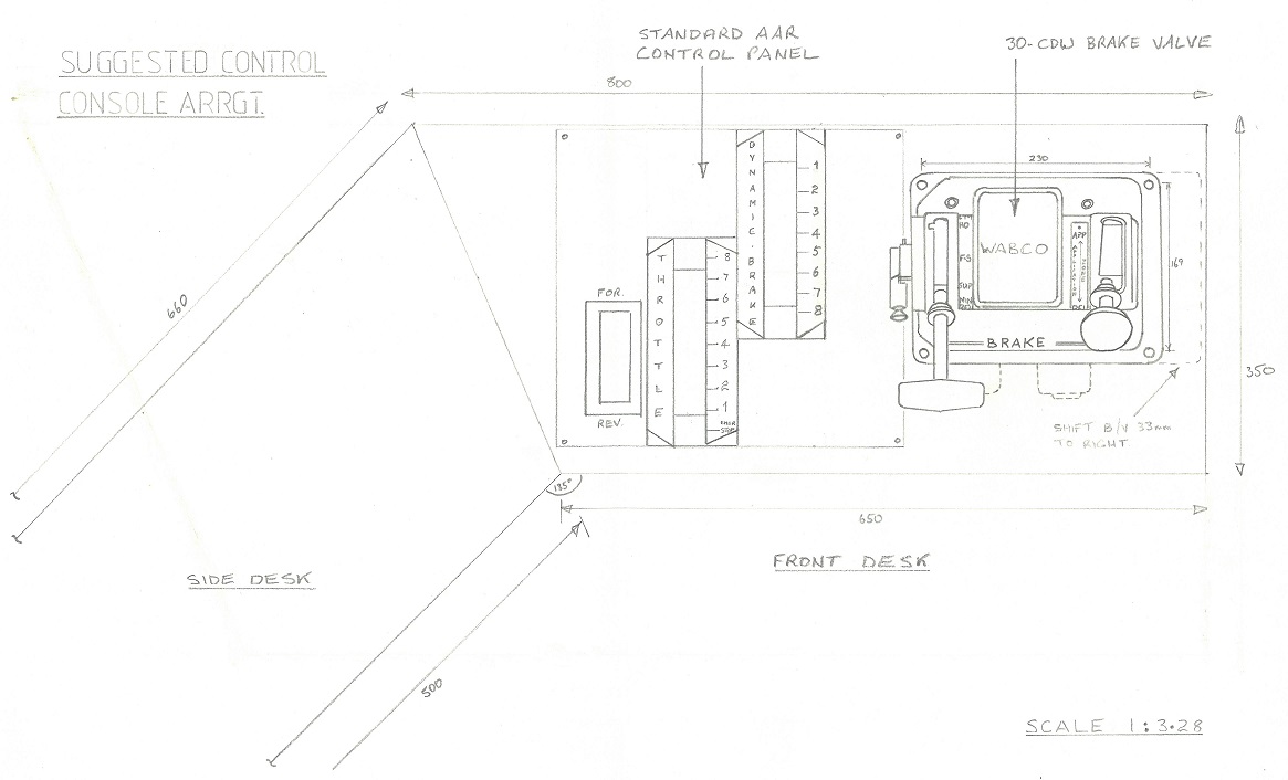 This proposal was an attempt to bring new air brake valve technology and a flat control desk arrangement into the cab. The concept suggested using the standard GE controller switch panel oriented horizontally. This idea was actually adopted, some years later, by Westrail in their P Class GE Dash 8s built by A. Goninan & Co.