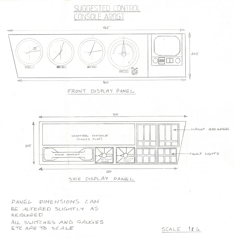 Compare this concept drawing with photos of the eventual product. Note the 4-position headlight switches (Off, Low, Med, High). This idea resulted from a union request. Most of the railroad had a well-built and maintained gravel-surfaced access road running immediately parallel and it was used by public as well as company traffic. Since much of the railroad was along long tangent sections, locomotive drivers were obliged to dim their headlights at night for extended distances so as not to blind on-coming drivers. The ‘Medium’ position was a practical solution that helped both parties.